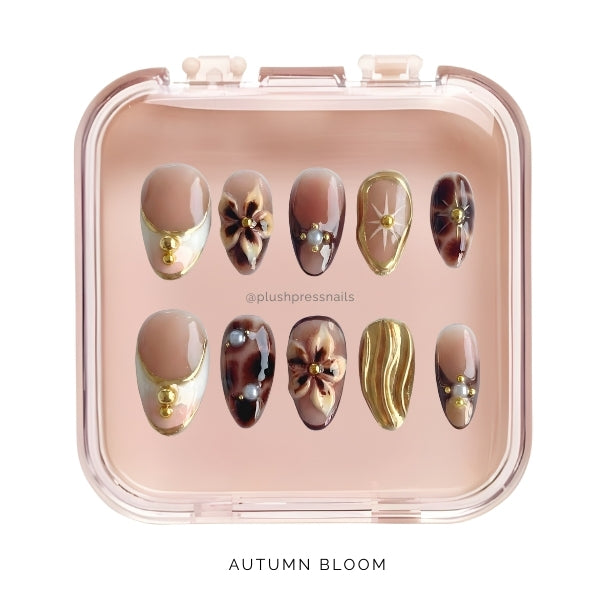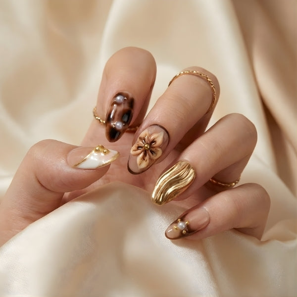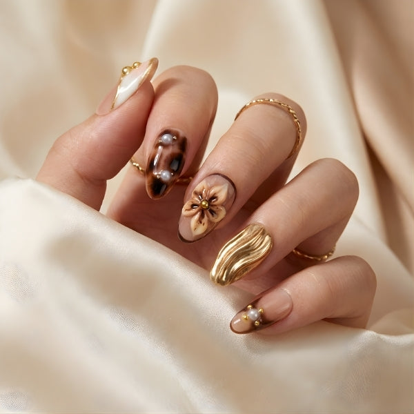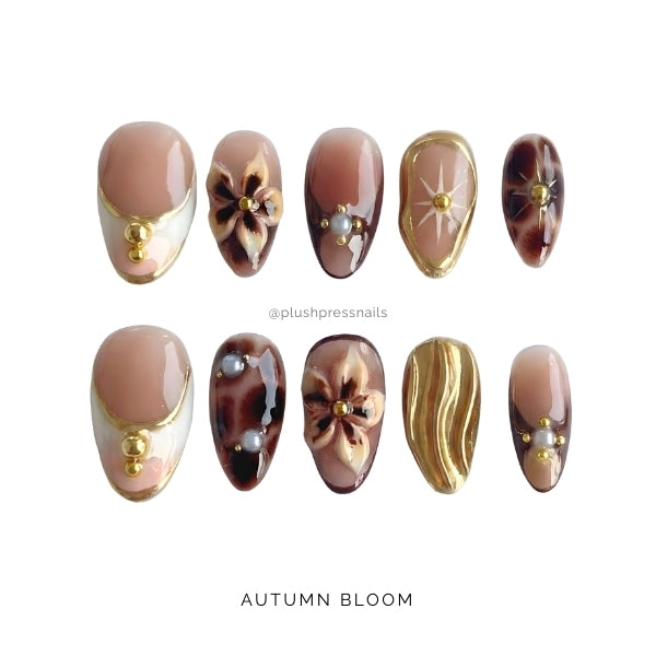 Each nail is a miniature autumn garden: intricate floral paintings in warm fall hues, organic gold leaf accents, tortoiseshell-inspired marbling, and creamy nude bases that ground the design.