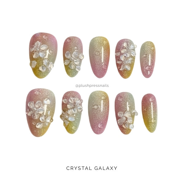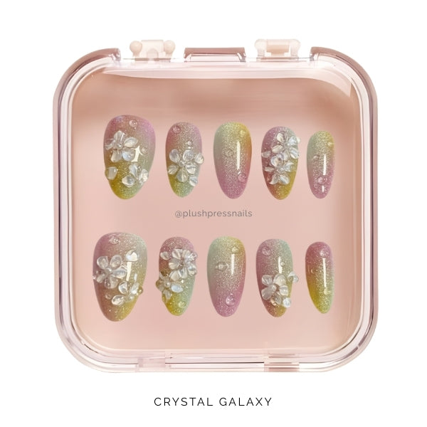 Crystal Galaxy features an iridescent ombré that shifts between purple, gold, and silver with a dreamy cosmic shimmer, all adorned with elaborate crystal and rhinestone embellishments that look like constellations mapped across your fingertips.