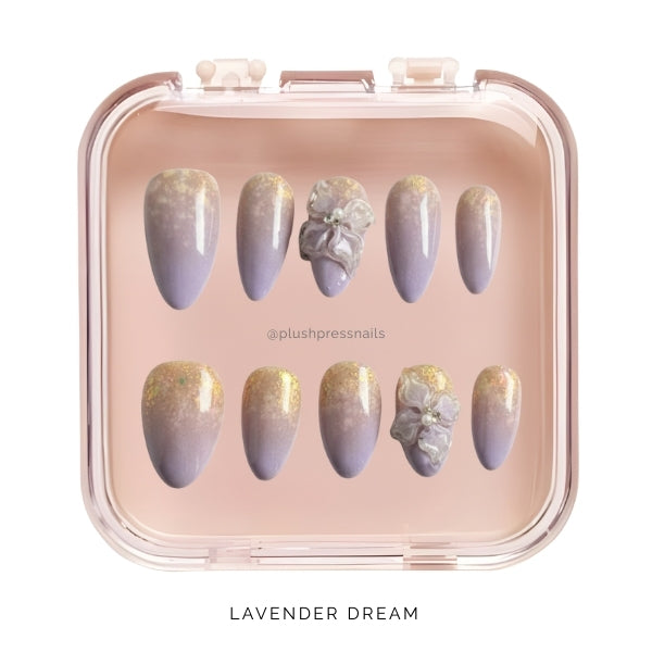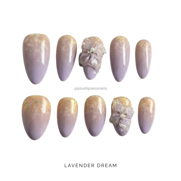 Lavender Dream features soft lavender jelly bases with beautiful gradient effects transitioning to peachy-gold, adorned with stunning 3D translucent purple flowers with crystal centers and delicate gold foil accents. The dimensional florals look like they're blooming right off your nails, creating an ethereal, almost magical effect.