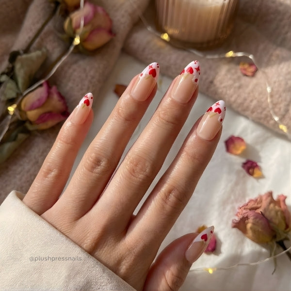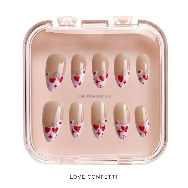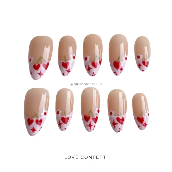 Love Confetti features a soft nude base with adorable white French tips adorned with scattered red hearts and stars that look like love is literally bursting from your fingertips.