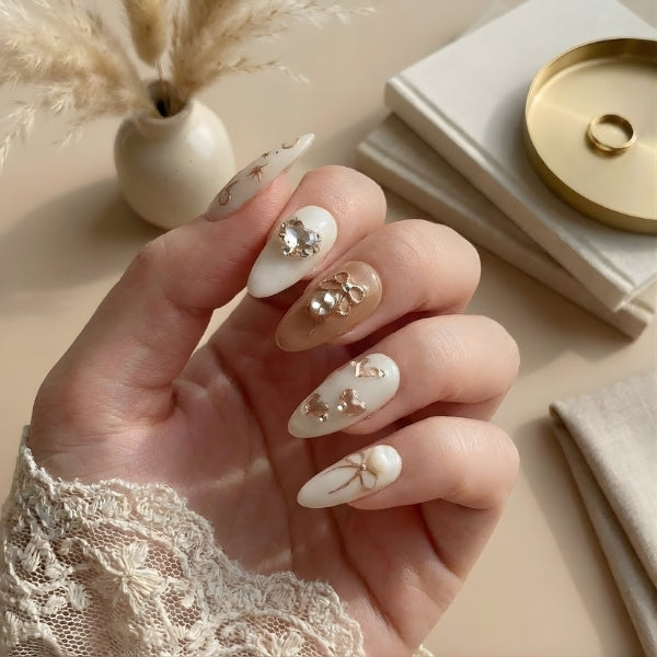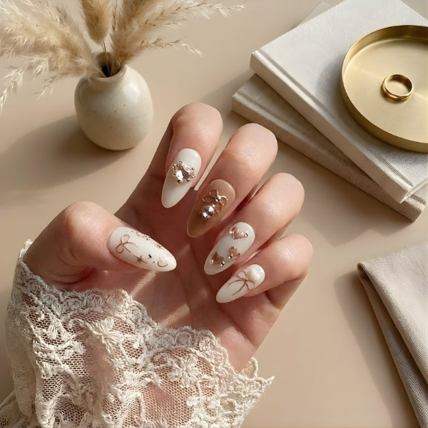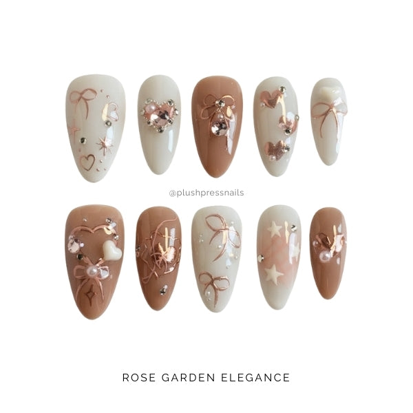 Rose Garden Elegance features a gorgeous mix of nude, white, and soft pink bases adorned with delicate 3D floral designs, rose gold foil accents, and pearl embellishments that look like a secret garden blooming on your fingertips.