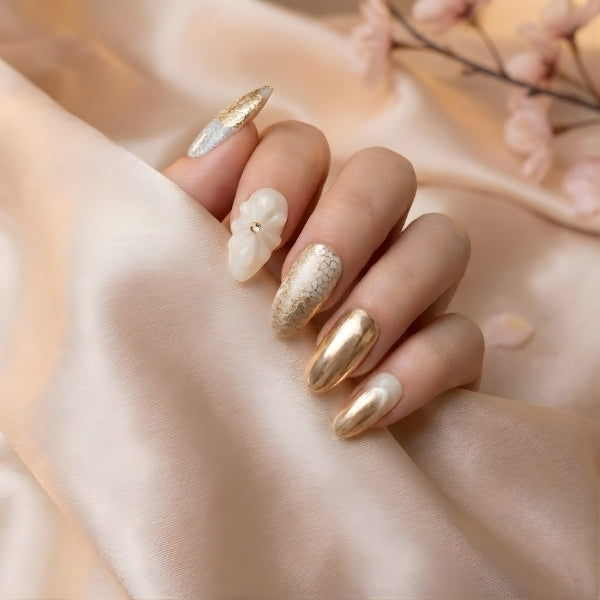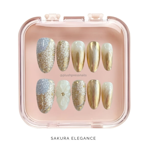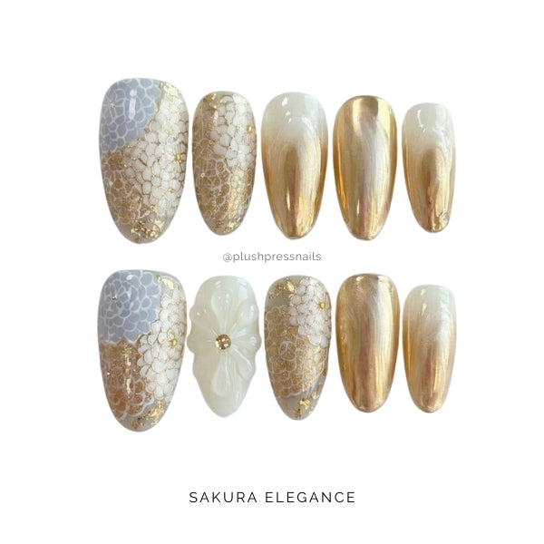 Each set tells a story: delicate sakura petals dance across milky translucent bases while champagne gold mirror-finish nails provide striking contrast.
