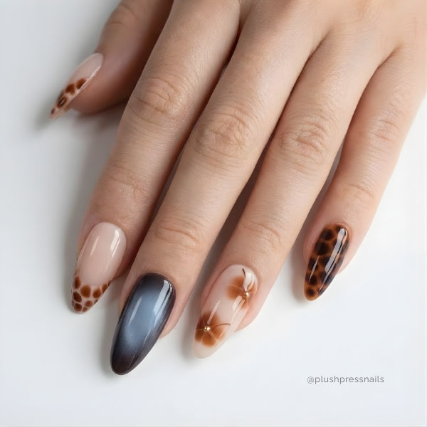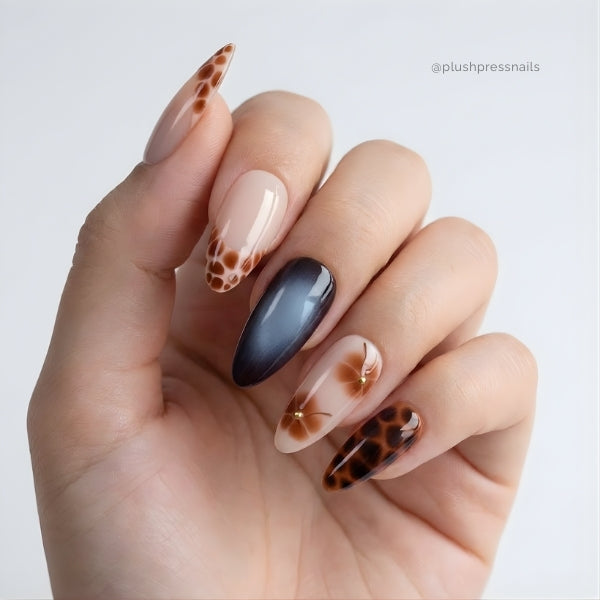 The mix of sleek solid black and animal print creates a look that's both edgy and sophisticated. These nails are for the woman who knows she's predator, not prey, who embraces her wild side while staying polished, and who understands that power can be beautiful.