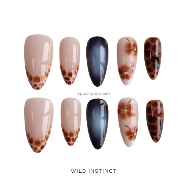 Wild Instinct combines soft nude bases with dramatic black coffin nails and stunning tortoiseshell/leopard print patterns in rich browns and blacks, accented with delicate bow details that add a touch of feminine contrast to the wild aesthetic.